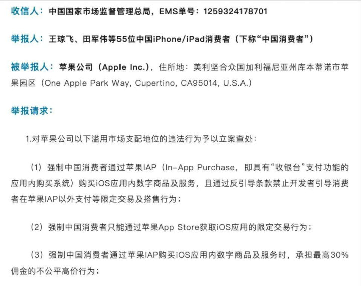 10月17日,王琼飞联合了55位苹果用户向国家市场监督管理总局发起了行政举报。